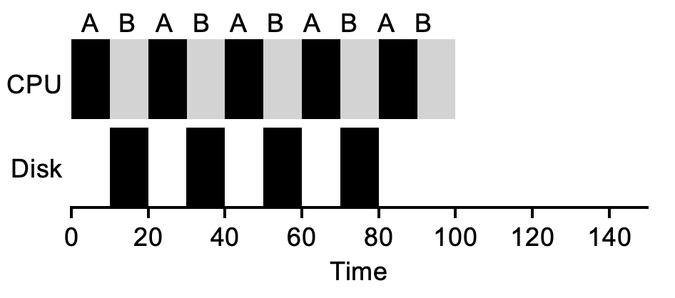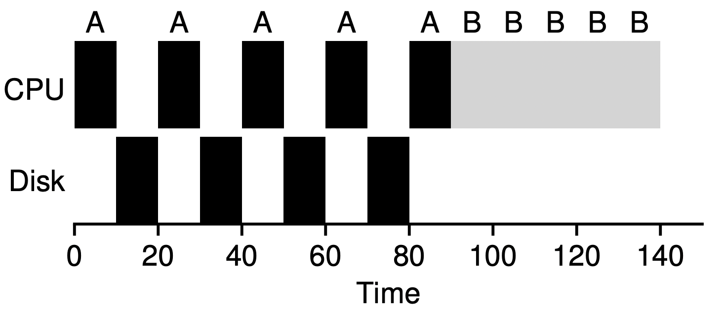 작업이 I/O를 요청(request)하면 현재 실행중인 해당 작업은 I/O 도중 CPU를 사용하지 않을 것이며 I/O가 완료되길 기다리며 Blocked 상태가 될 것이다. I/O가 Hard disk drive로 보내지는 경우 I/O load에 따라 몇 밀리초 이상 걸릴 수 있고, 따라서 스케줄러는 그 시간 동안 다른 작업을 CPU에 할당하도록(schedule) 결정할 수 있다.