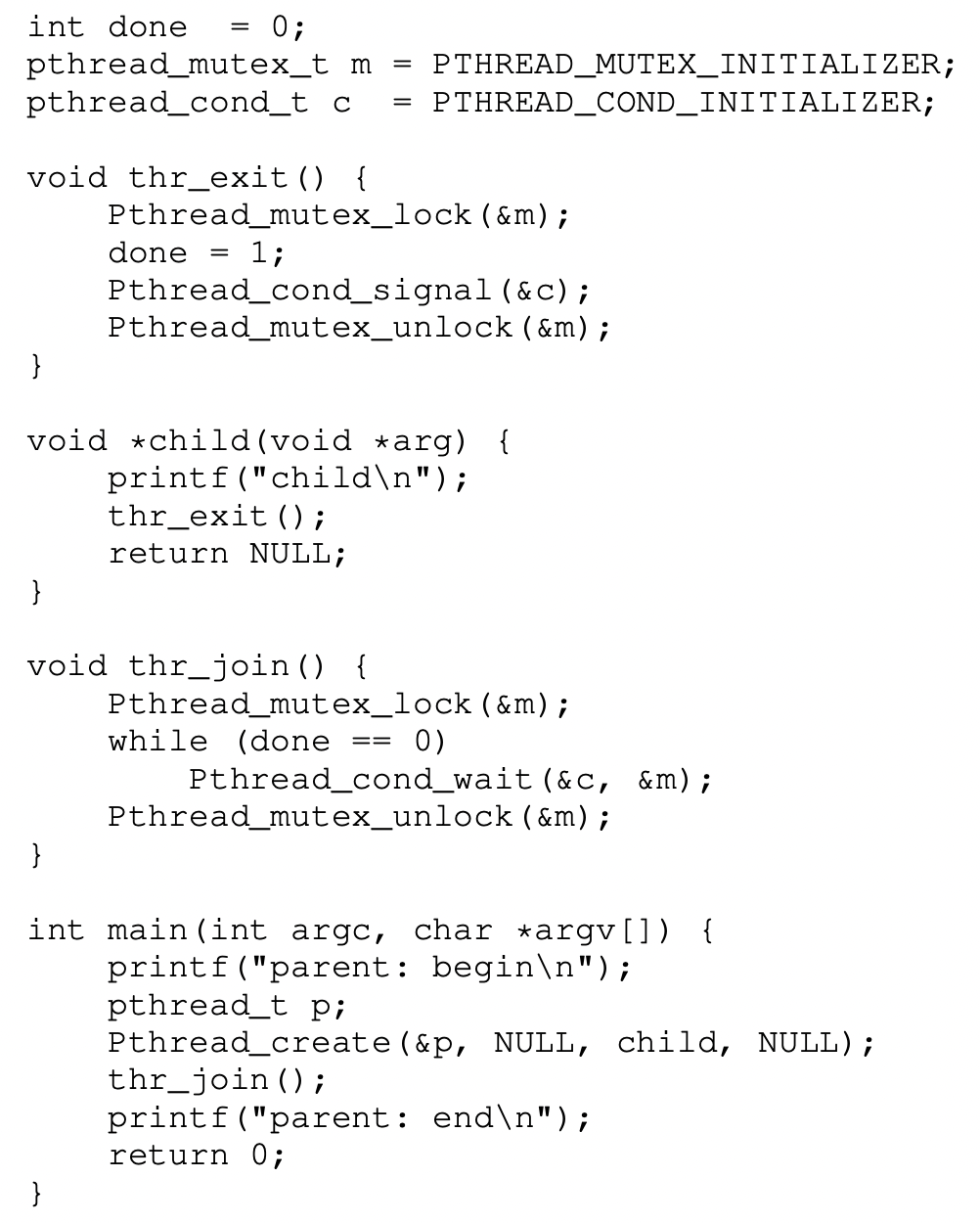 부모는 자식 스레드를 만들지만 스스로 실행을 계속한다(우리는 하나의 프로세서만 가지고 있다). 따라서 자식 스레드가 완료될 때까지 기다리기 위해 즉시 thr__join()으로 호출한다. 이 경우 lock을 획득하고, child가 완료되었는지(아닌지) 확인한 후 wait()를 호출해 스스로 sleep한다.(따라서 unlock된다).