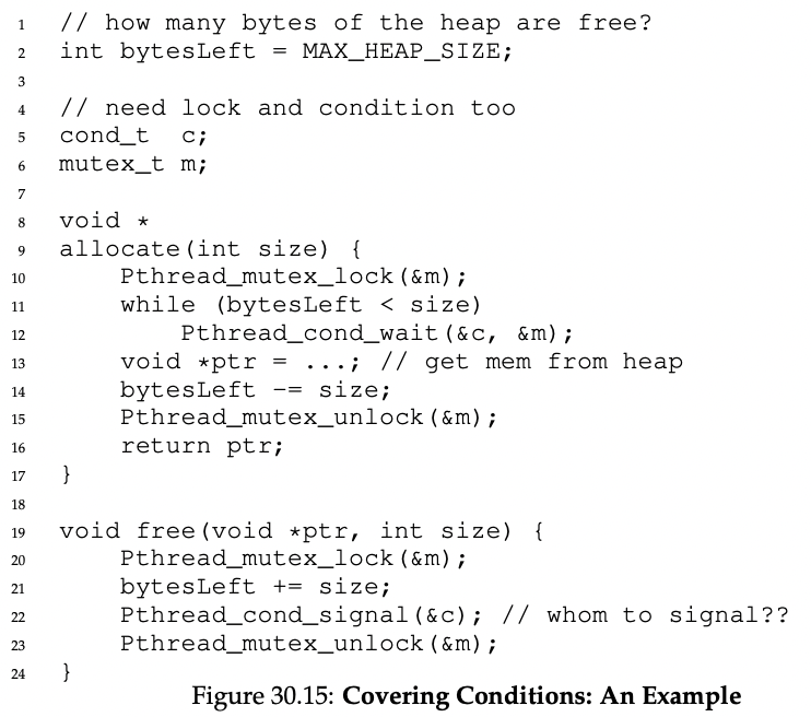 여기서 문제는 어떠한 스레드에 신호를 보내야 하는 가이다. 예를 들어, free()를 통해서 여유 메모리가 100이 되었는데, 메모리를 할당받으려하는 두 스레드(첫번째 스레드는 150만큼의 메모리를, 두번째 스레드는 50만큼의 메모리를 필요로한다.) 중 첫번째 스레드를 깨운다면 여유 메모리가 부족하여 할당받을 수 없으므로 다시 sleep상태가 되고 할당받을 수 있던 두번째 스레드에게는 기회가 가지 않는 문제가 발생한다. 즉, 수행할 수 있는 스레드가 있음에도 아무것도 수행하지 않는 상태가 된다.